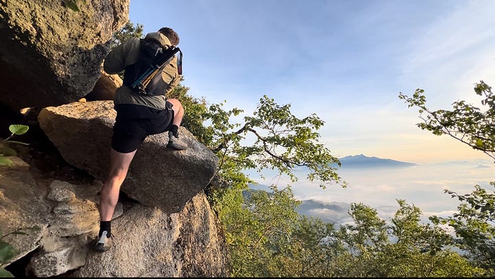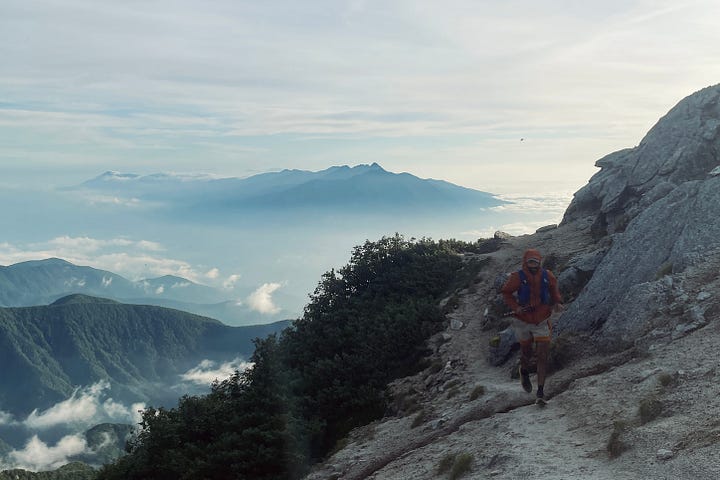 We began at half-past midnight, a furtive trot past Ojiro Campground and through the shrine of Chikuu-Komagatake, its torii barely discernible in the darkness. Then the climb, sudden and severe, and... company! Eyes flashed in our headtorches, startling us into a momentary panic before settling into watchful curiosity. Deer. The deer, we told ourselves, were augurs of safety. “If the deer are here, surely there are no bears.” Right?
