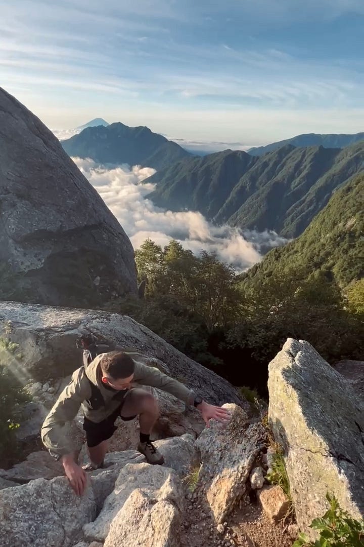 The summit came later, a bristling ridge of chains and scramble sections, each one a test of vertigo. It was “fun” then, unthinking and fearless, though hindsight reveals just how sharp the teeth of that ridge were. Mitsukashira then beckoned: a traverse seductive in its emptiness, unmarked as if by design. Confidence - no, arrogance - blinded us to the necessity of detouring for water. Thus chastened, we plunged into a forest primeval, a green sarcophagus whose trails had been etched, perhaps, by a shogun’s ghost. Bushwhacking restored us to the ridge, but the mood was tinged with fatigue, the thrill of the climb now shaded by hard-earned caution.
